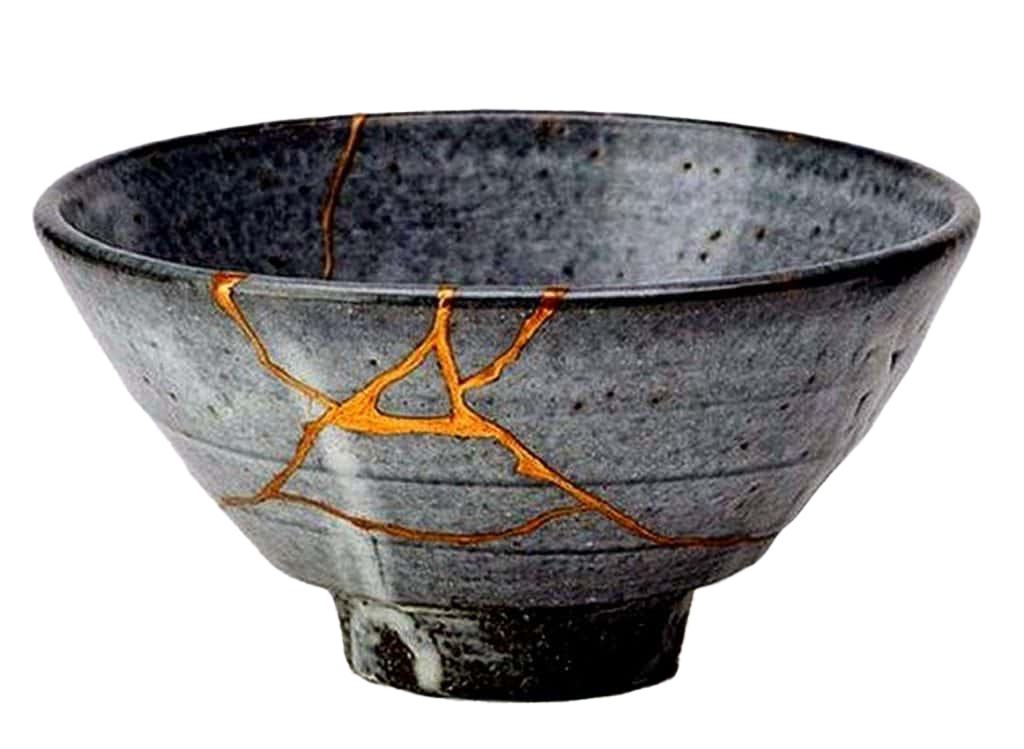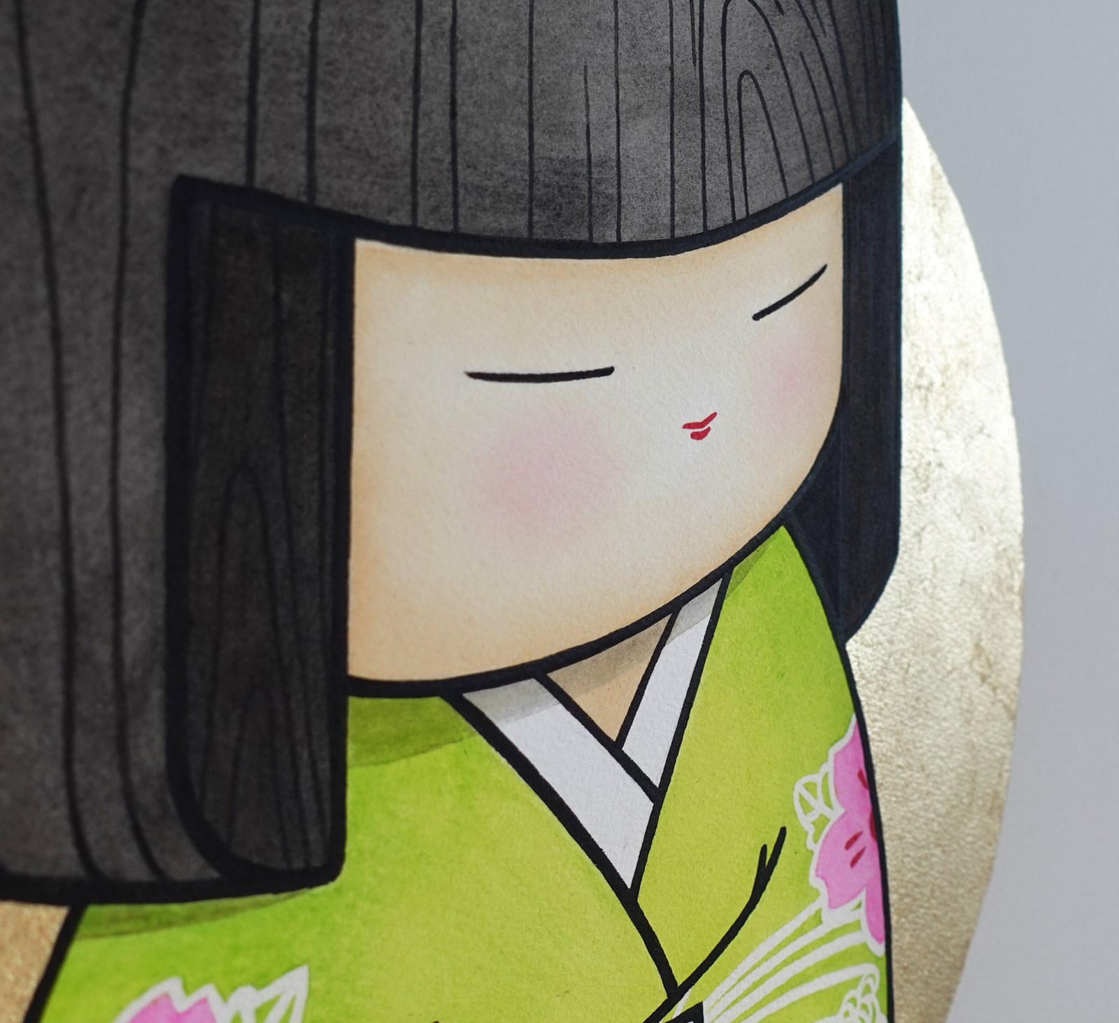 Kintsugi is a Japanese craft of repairing broken pottery with joinery made from ingredients like lacquer and gold dust. Yet it is far more than an art that addresses an aesthetic. It is part of a deeper philosophy that embraces the beauty of flaws and adds value by way of brokenness, even elevating it. — The Kokeshi figures in this series wear their symbolic imperfections (Kintsugi tea pots) honorably, as treasured crowns.