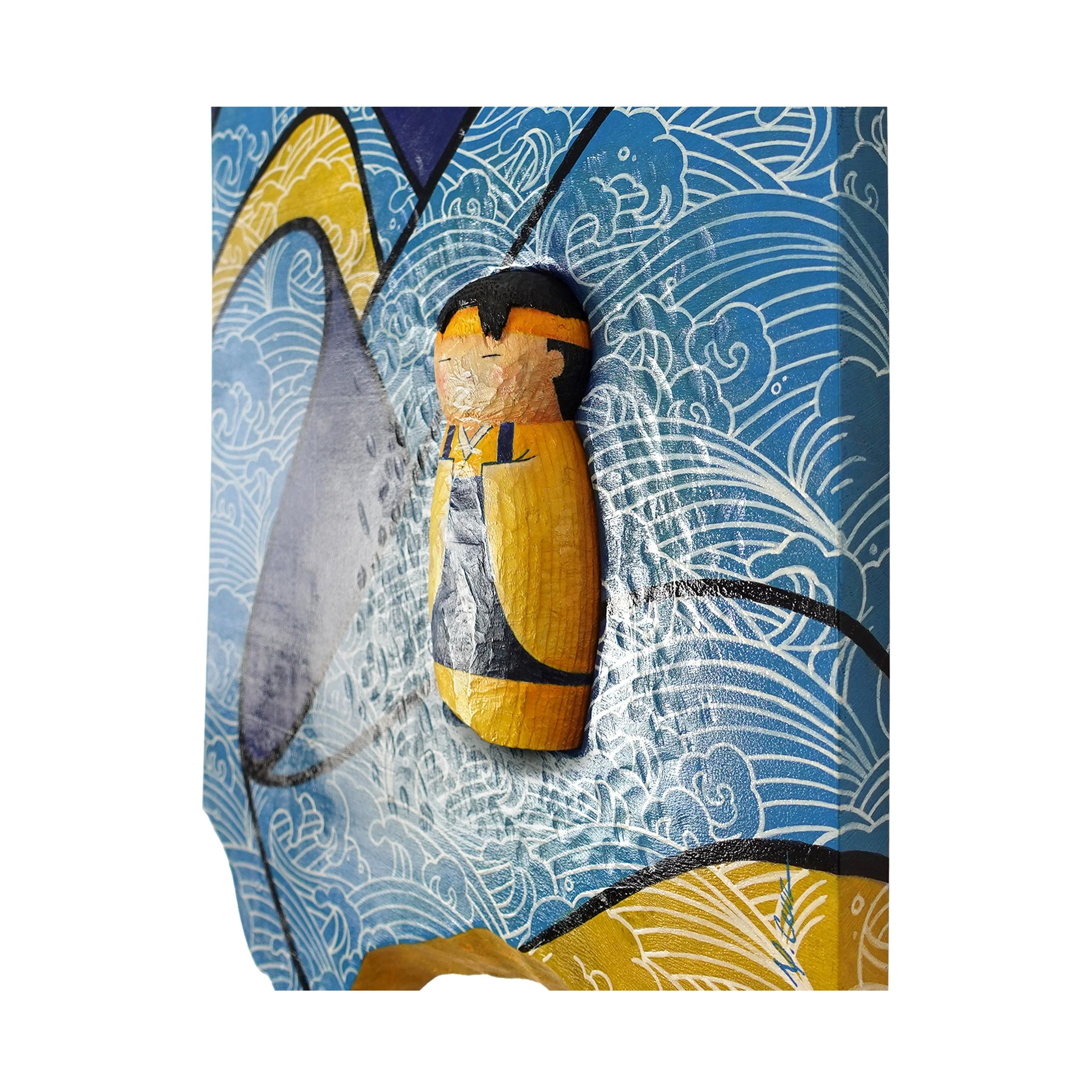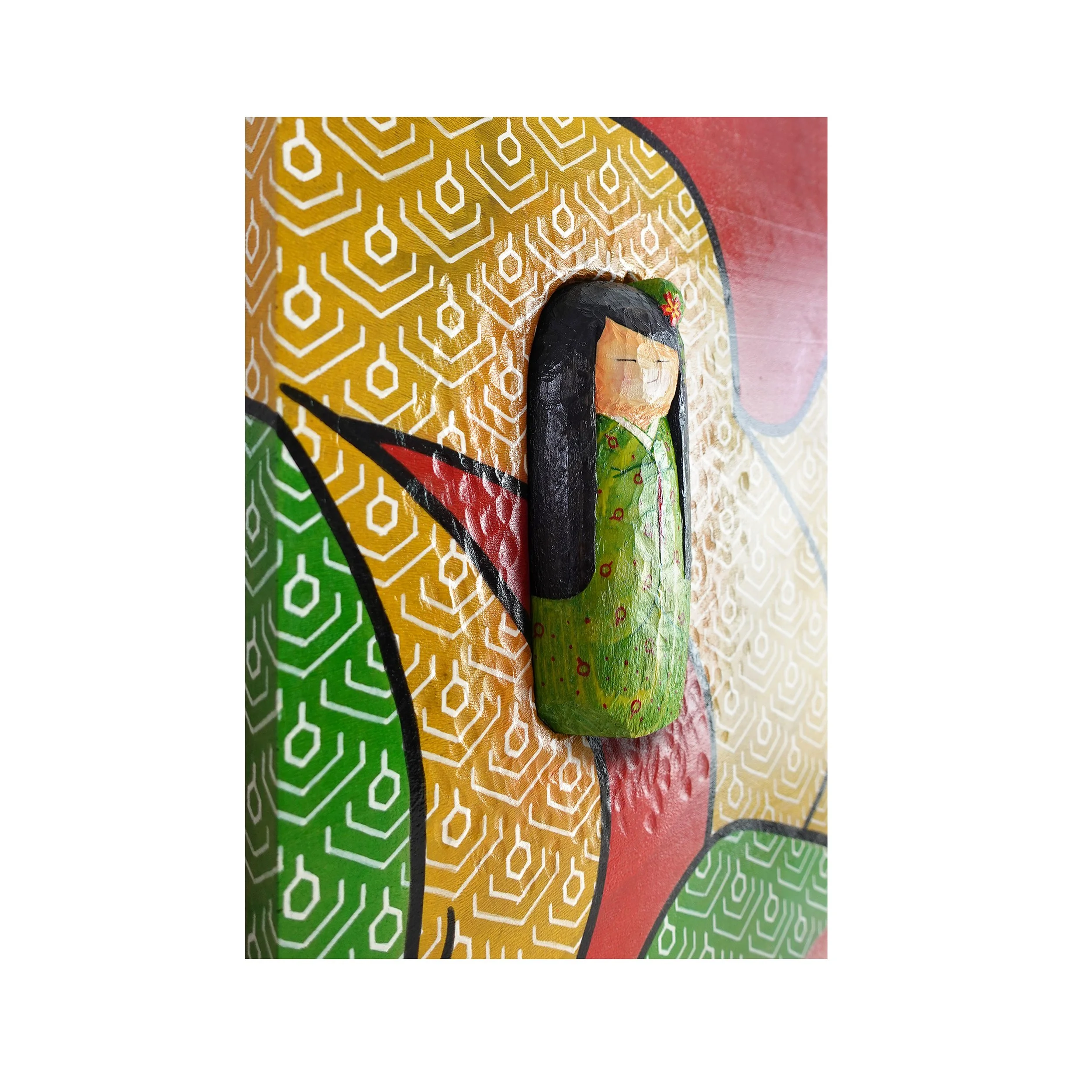 This series explores imaginary worlds inhabited by Kokeshi dolls. (Kokeshi are limbless wooden Japanese toys with a rich history of over 150 years.) I’m energized by the concept of ‘wood from wood’ (wooden toys from wooden worlds). In these works you see the portals to these worlds, inspired in part by the folds, patterns and layers found in Kimono garments. These layers create a textile gateway into a colorful imaginary world.